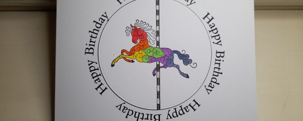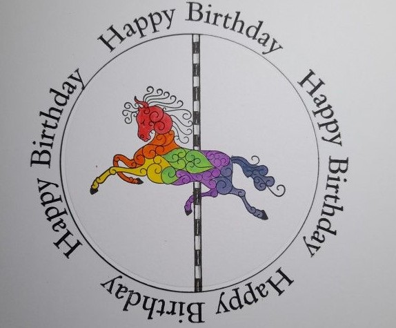 I then watercoloured the horse using Distress inks in rainbow colours. I used Festive Berries, Ripe Persimmon, Mustard Seed, Mowed Lawn, Wilted Violet and Chipped Sapphire. I finished the circle off by running a black Sharpie round the edge, to just define it on the card. I wasn’t sure how well this would work, as I’ve only done that on straight edges until now. Have to say it went well – the key was doing it in two halves, I started and finished at the carousel pole each time so the join wasn’t obvious.