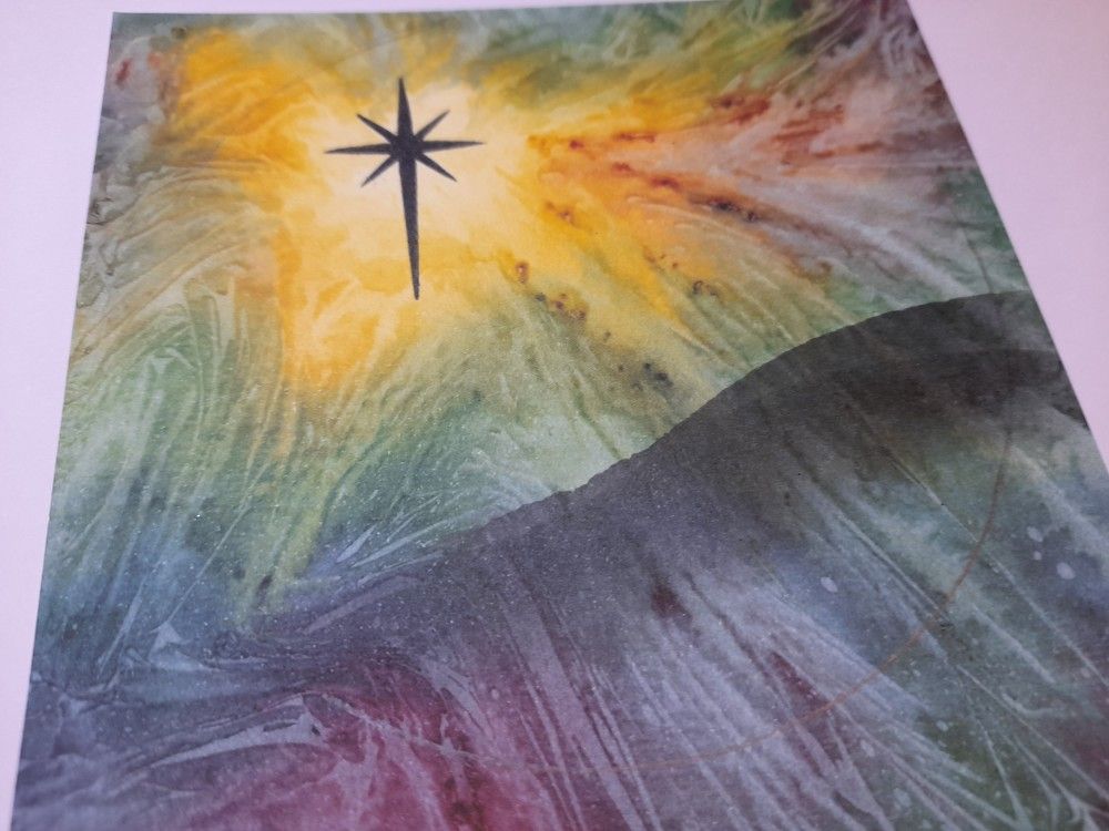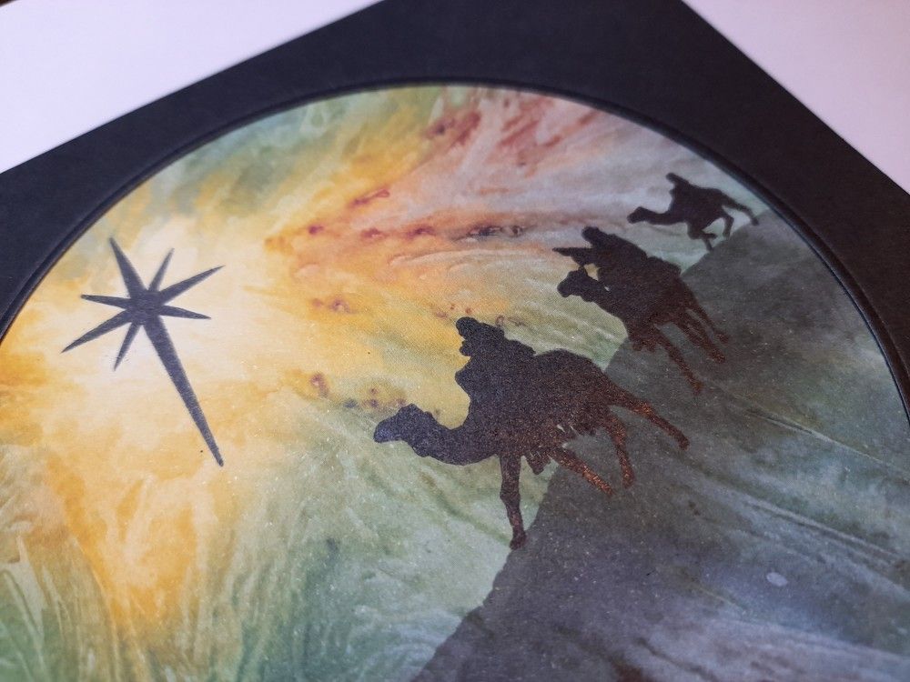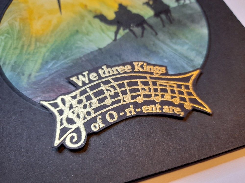 I remembered that I’d got these stamps from Claritystamp, so decided to put them to good use. I started with a piece of the Clarity ‘Northern Lights’ designer card – the golden area in this was just perfect for a light shining in the sky. I trimmed it down to fit on a 6×6 card, and then die cut a circular aperture in the black card blank. I marked the circle onto the designer card with a pencil, so that I could get the stamps positioned in the right place, and stamped the star in black Archival over the golden area. I also tore a piece of copy paper to make a mask, using an oval die as a guide to get the hill shape, and then used a make up sponge to drag black Distress Ink onto the card to make the hill for the Magi to travel along. Again, having the pencil circle mark was useful for positioning the hill.