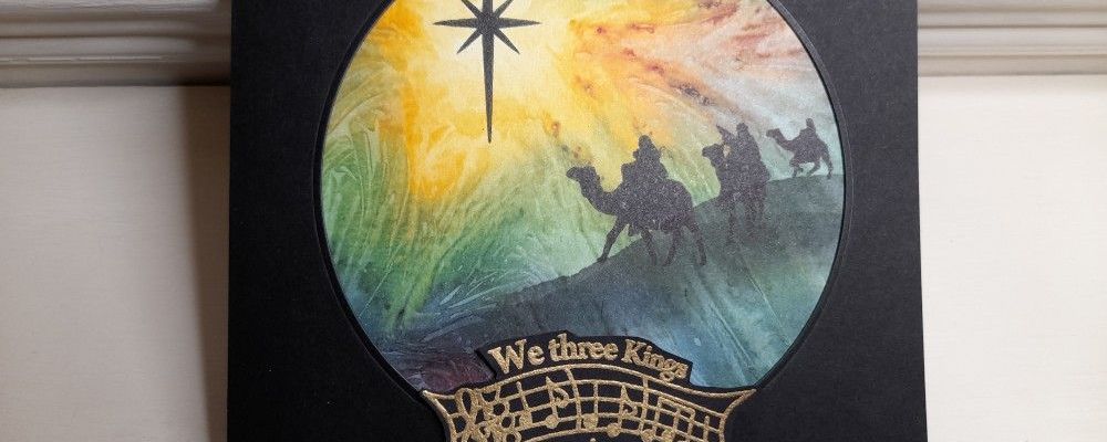 I remembered that I’d got these stamps from Claritystamp, so decided to put them to good use. I started with a piece of the Clarity ‘Northern Lights’ designer card – the golden area in this was just perfect for a light shining in the sky. I trimmed it down to fit on a 6×6 card, and then die cut a circular aperture in the black card blank. I marked the circle onto the designer card with a pencil, so that I could get the stamps positioned in the right place, and stamped the star in black Archival over the golden area. I also tore a piece of copy paper to make a mask, using an oval die as a guide to get the hill shape, and then used a make up sponge to drag black Distress Ink onto the card to make the hill for the Magi to travel along. Again, having the pencil circle mark was useful for positioning the hill.