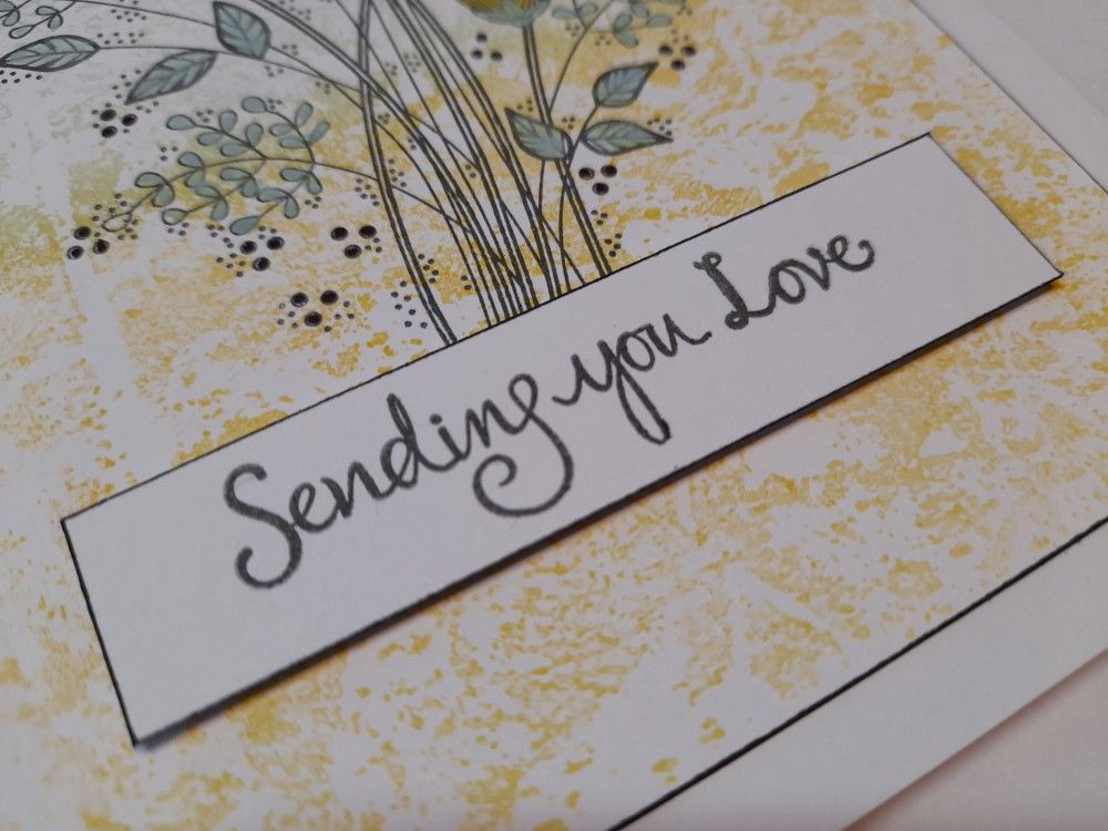 I started with the ‘Dots and Spots’ A5 texture background stamp, which I’ve used quite a few times recently. I sponged Distress Oxides in ‘mustard seed’ and ‘speckled egg’ onto it, trying to keep them fairly separate as I didn’t want them blending into green in the centre. Once the stamp was covered with ink, I spritzed it with water and stamped it onto a large square of card. I then stamped the flower spray onto the card, using Archival ink in ‘watering can’.