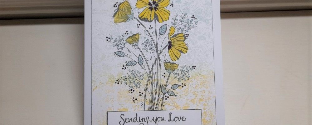 I started with the ‘Dots and Spots’ A5 texture background stamp, which I’ve used quite a few times recently. I sponged Distress Oxides in ‘mustard seed’ and ‘speckled egg’ onto it, trying to keep them fairly separate as I didn’t want them blending into green in the centre. Once the stamp was covered with ink, I spritzed it with water and stamped it onto a large square of card. I then stamped the flower spray onto the card, using Archival ink in ‘watering can’.