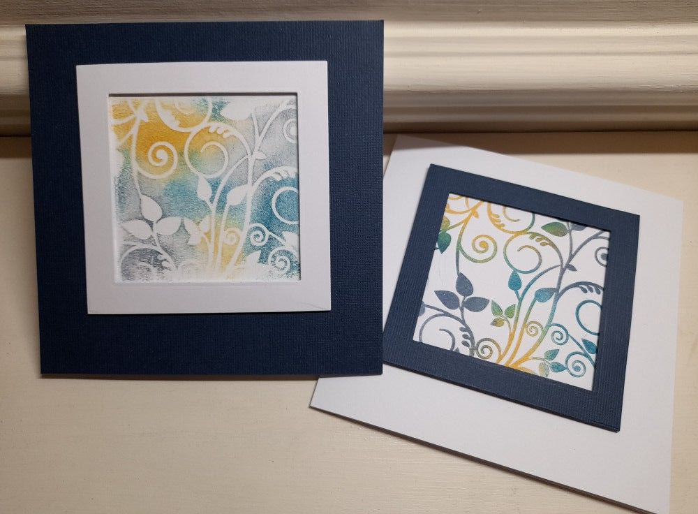 For the second card, I simply attached the stencil impression to a 6×6 white card blank, and then added a die cut frame in navy card, again using foam pads.