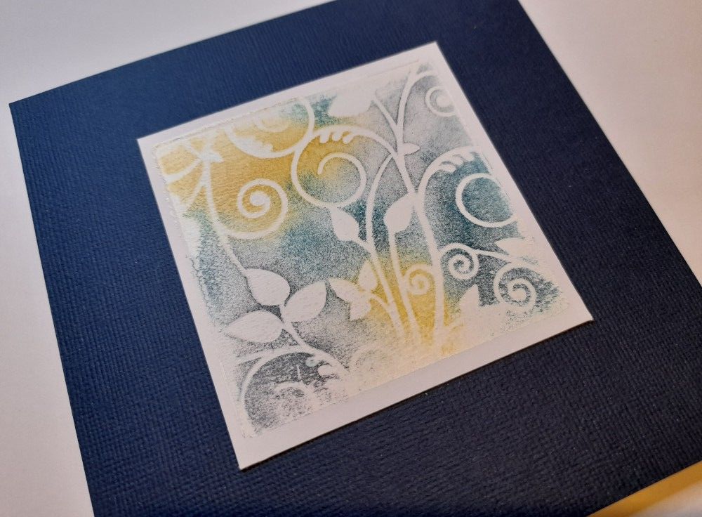 I’d done all the work on the backgrounds, so decided to go for a simple card design that showed them off. for the first one, I covered a 6×6 card blank with a piece of dark blue card and attached the Gel Press print in the centre