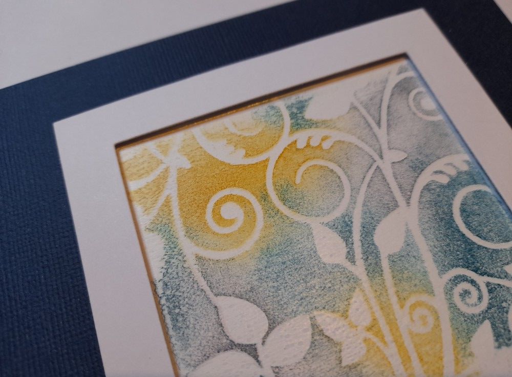 I got two prints from each stencil – the one on the left used the mini Gel Press and the petite ‘leafy swirl’ stencil with alcohol inks (butterscotch, demin and stream) and acrylic paint. The one on the right is the impression from the ink that was left on the stencil after the first print. It’s very addictive!