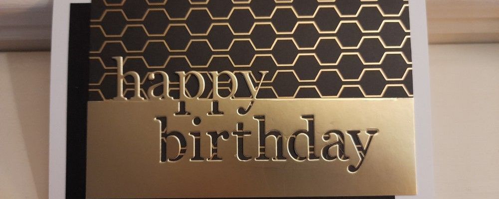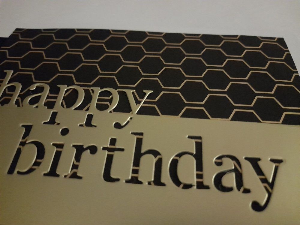 All I then needed to do was attach it to a 5×7 card blank and it was finished. I do like gold and black together on a card – it looks quite luxurious.