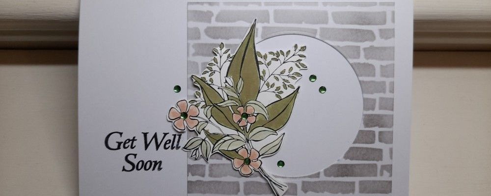 Next was to create the frame for the card that’s in the picture from Fusion. I decided to create a brick wall effect for the flowers to sit against, and used a stencil from Claritystamp, brushing ‘slate’ Adirondack ink through it. Once done, I die cut a circle in the centre of the card before attaching it to a 5×7 card blank.