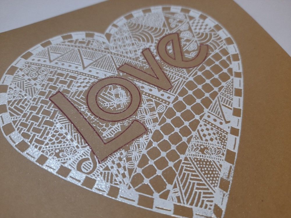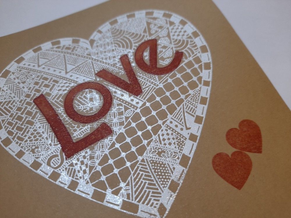 Welcome to my crafty blog. I’ve been playing with a new stamp set today that only arrived in the post this morning – Claritystamp’s ‘Love Heart Doodle’. It’s a gorgeous intricate design, and I decided it would look great embossed in white on kraft card.
