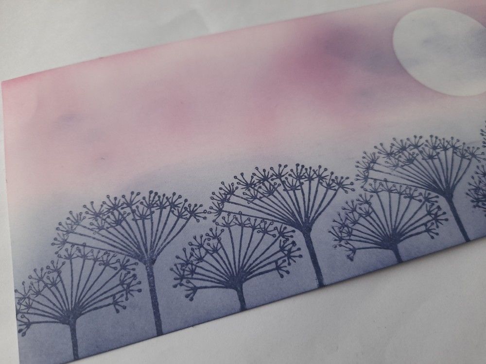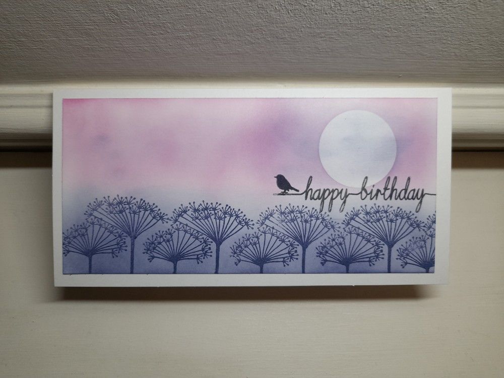 I decided to use a DL (slimline) card this time, and so first cut a piece of white card to fit the card blank. I put one of the Clarity moon masks into the top corner, and then blended Distress Oxide in ‘chipped sapphire’ and ‘picked raspberry’ across the card. Once done, I lifted the moon mask off and added a bit more of the pink & blue across the moon to soften the edges and give the sense of clouds. I think I was probably a bit too heavy with the dark blue, so blended it in a bit further with the pink.