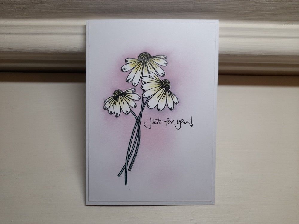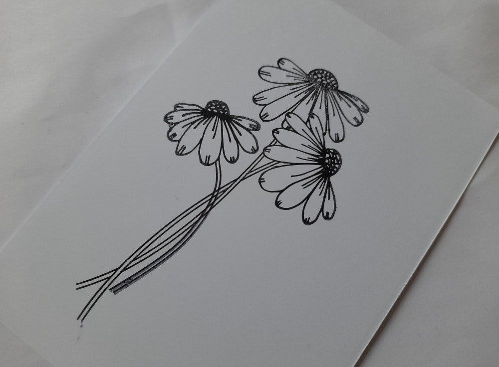 I started by stamping the double daisies in black Archival onto a piece of white A6 card, and then added the single daisy to nestle in next to them.