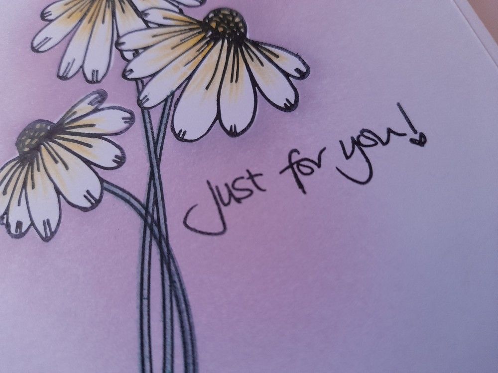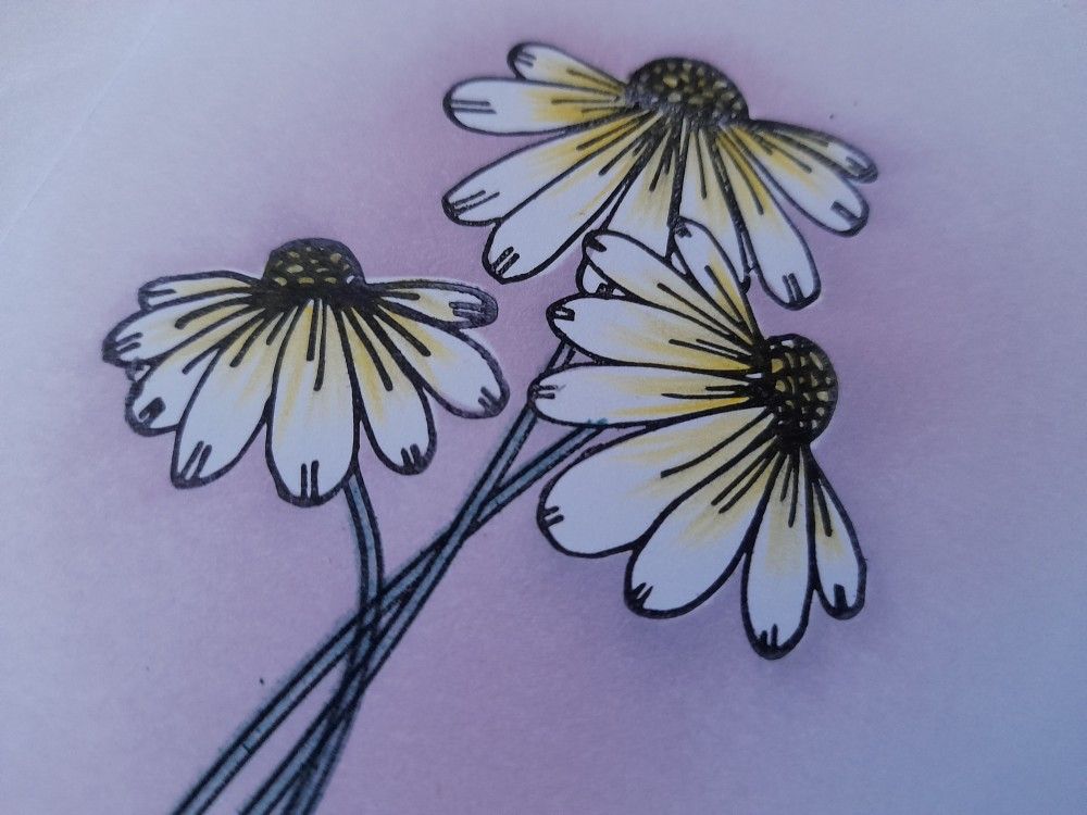 I then covered the daisy heads with masks cut from sticky notes and brushed ‘spun sugar’ Distress Ink gently outwards from the flowers, to give a hint of colour in the background. I added a little yellow to the flower heads with a Spectrum Noir pencil, and used a jade green for the stems.