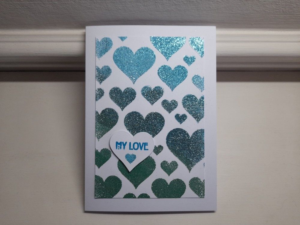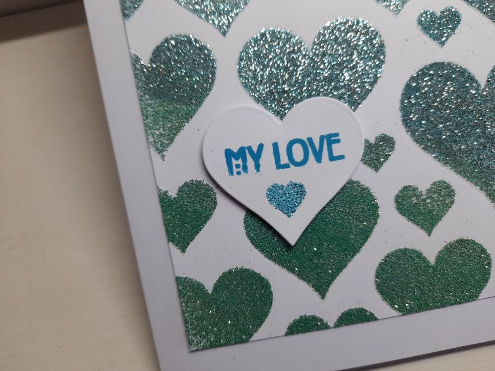 I kept the stencil taped in place, and pressed a WOW embossing ink pad across the hearts, to cover them all. I then lifted the stencil off quickly, and used three toning WOW powders to cover the inked hearts. You need to add each colour in turn, and I aimed to sprinkle it across a third of the card each time. I used ‘glamour green’, ‘aquamarine’ and ‘totally teal’, making sure I’d shaken off the excess and put it back in the pot before moving on to the next colour. I then heated the whole piece to set the powder.
