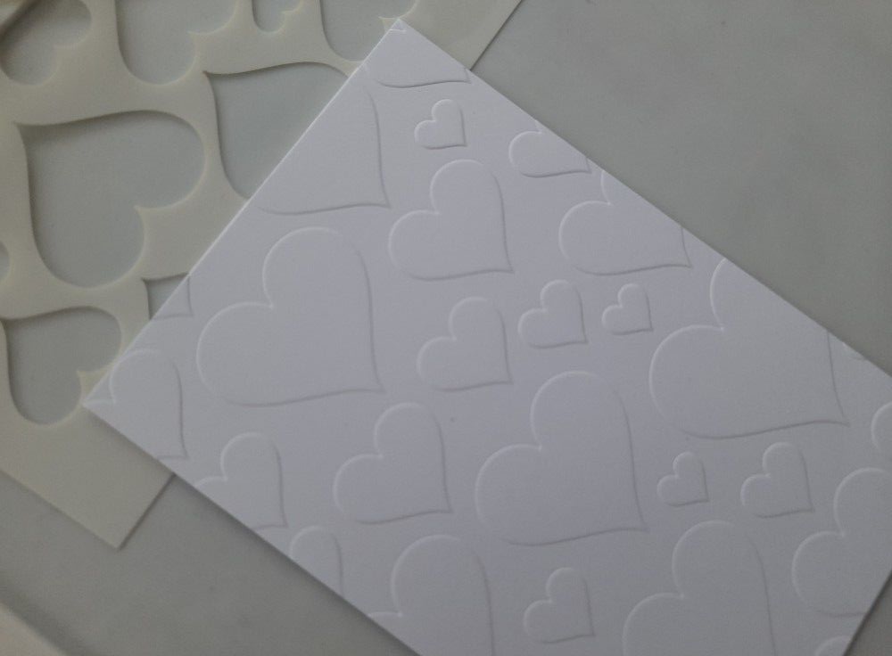 I started with the hearts stencil from the Clarity ‘basic backgrounds’ set and attached it to a piece of smooth white card that I’d cut down to fit a 5×7 card blank. I then ran it through my embossing machine to give the hearts some definition (you can do this with Clarity stencils as they are very robust).