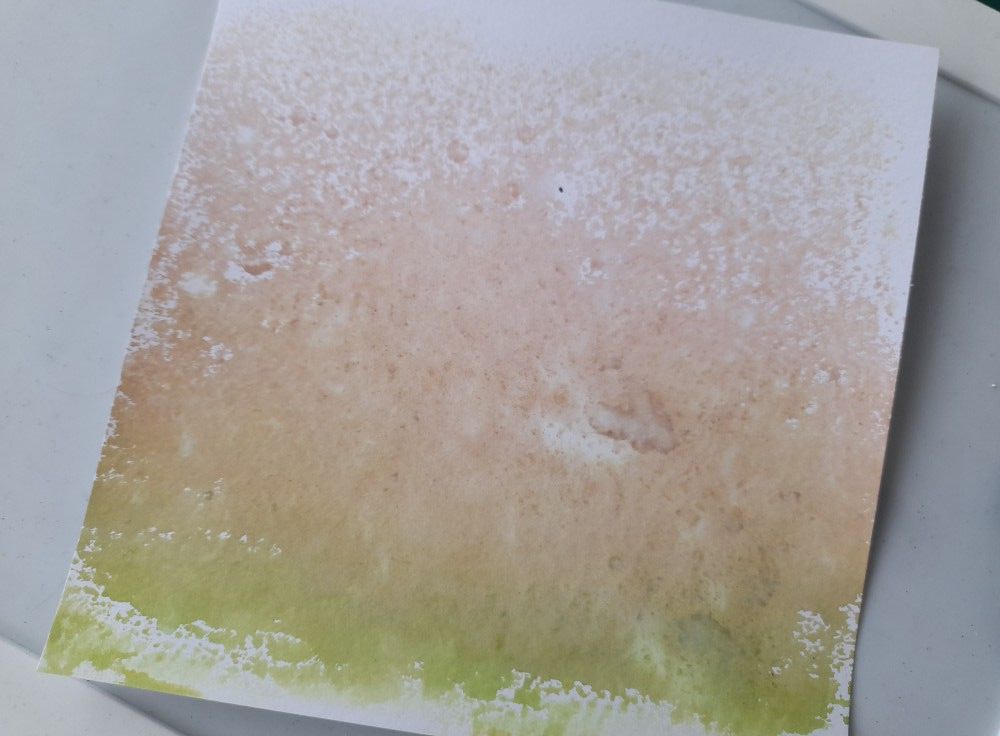 I needed to make a background with blended inks, and decided to go for similar tones for a change, instead of a contrast. I couldn’t exactly remember what colour inks were on the card (I must get better at making a note on the back of my mop up pieces), but thought that my new Distress Oxides in ‘tattered rose’ and ‘dried marigold’ would work, together with some ‘mowed lawn’. I just used a blending brush to ink up a piece of smooth white card with the three colours.