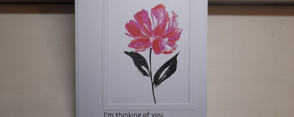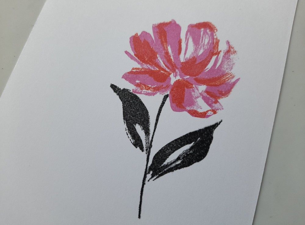 I started by stamping the flower onto a piece of white card. The background petals were first in ‘picked raspberry’ Distress Oxide, and I then added the accent petals in ‘festive berries’. Thirdly, I stamped the stem and leaves in ‘black soot’ Distress Ink.