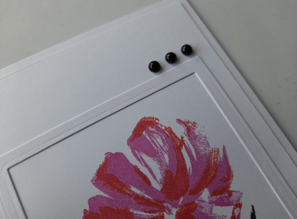 I finished the card by mounting the topper on a 5×7 card blank, and added three black pearls along the top of the frame to balance the sentiment.