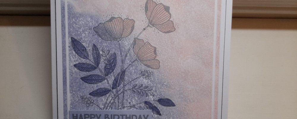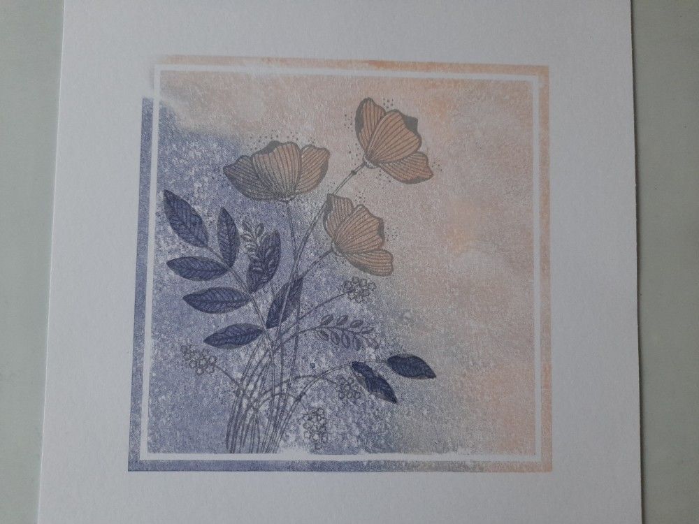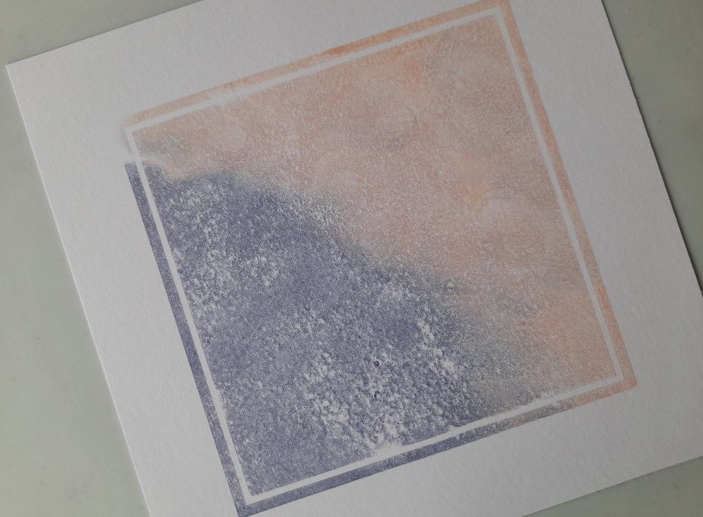 I started with the larger of the square backdrop stamps and dabbed Distress Oxides onto it in ‘chipped sapphire’ and ‘tattered rose’. I then gave it a quick spritz with water and stamped it down onto a piece of stencil card. I managed to get another image without reinking the stamp, just by spritzing it with more water, which I can used later. On reflection, I should have brought the blue ink right across the bottom of the square, but never mind.