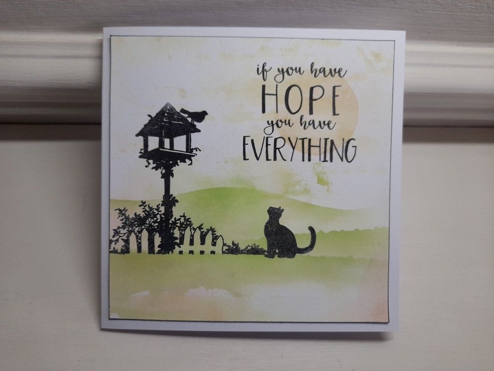 Welcome to my crafty blog. I’ve decided it’s time I started using up some of the inky backgrounds that I create by mopping up spare ink from my craft mat. Today’s card is the first of several over the next few days. I’ve used one of my all-time favourite stamp sets – the ‘birdhouse garden’ from Claritystamp, with a sentiment from Visible Image. I thought it was perfect for this scene – that cat definitely sums up the meaning of hope! Life here in the UK is also looking a lot more hopeful, after the Prime Minister’s announcement last night on the roadmap out of lockdown. It will be a little while yet, but it feels like there is now a light at the end of the tunnel.