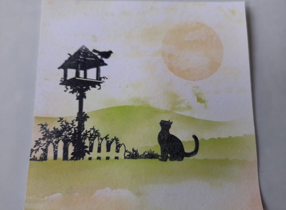 I trimmed it down to size for a 6×6 card blank and then stamped the birdhouse, cat and bird using Archival black, aiming to make best use of where the landscape seemed to be.