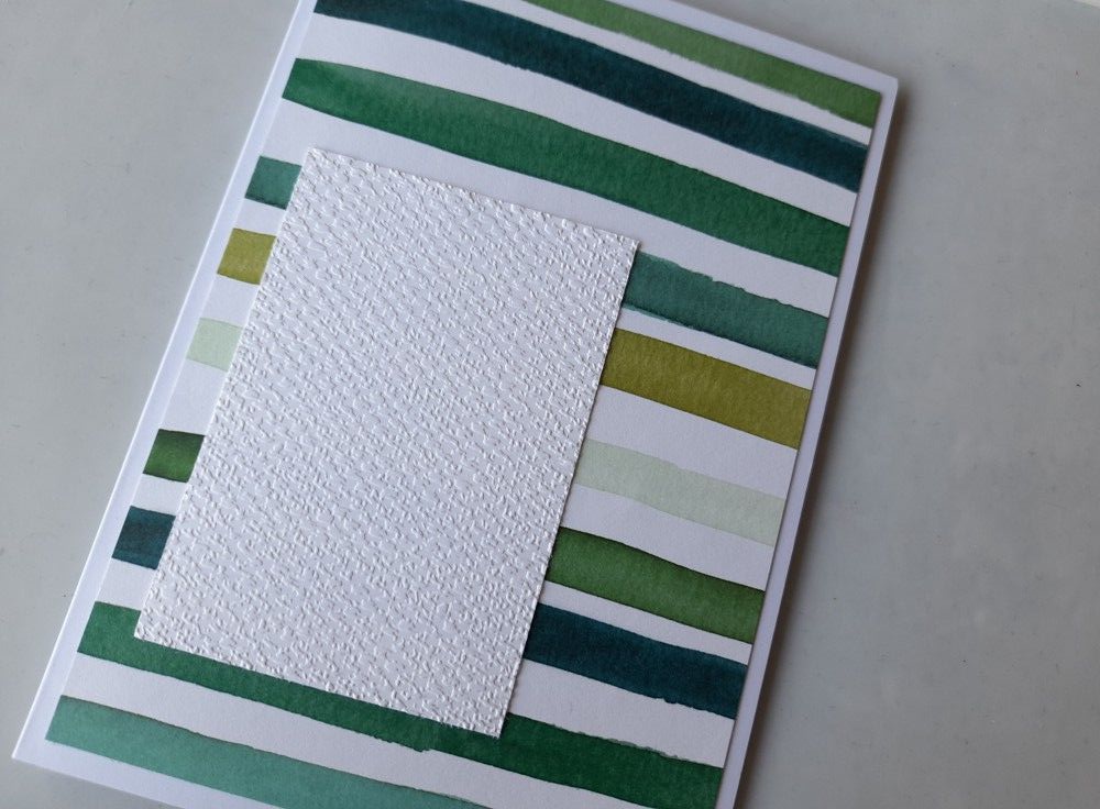 I’d remembered that the reverse side of one of the papers in the SU ‘forever greenery’ set was a really nice stripe pattern, so decided to use that as all the ones with leaves, etc, just looked too busy. I cut a piece down to fit on a 5×7 card blank, and then cut a small rectangle of white card which I embossed using the ‘tasteful texture’ folder and also attached to the card front. This is where I adapted the design a wee bit – I’ve used a rectangle rather than a square, and I have got a stripe running behind it, it’s just there are a few more as well!