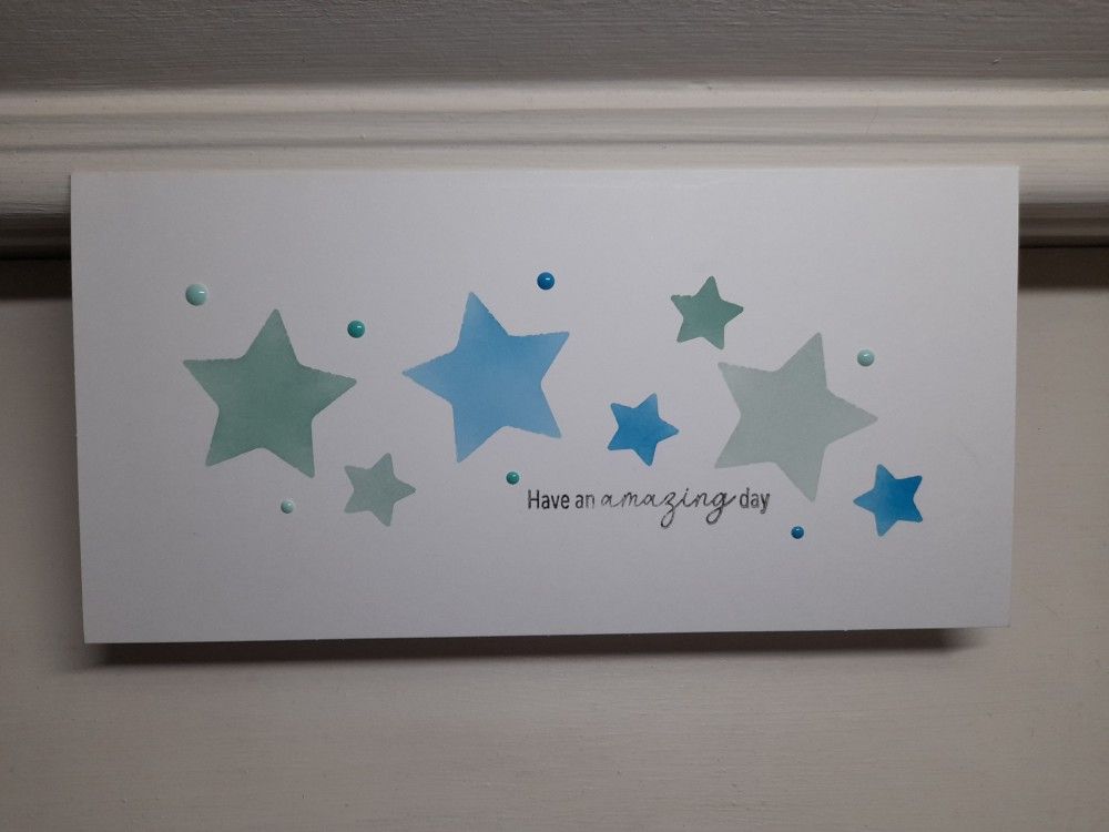 I then positioned the star mask onto a slimline card blank, and used a blending brush to add Distress Oxide ink. I did the three larger stars first, in ‘mermaid lagoon’, ‘speckled egg’ and ‘evergreen bough’, then added the little stars inbetween.