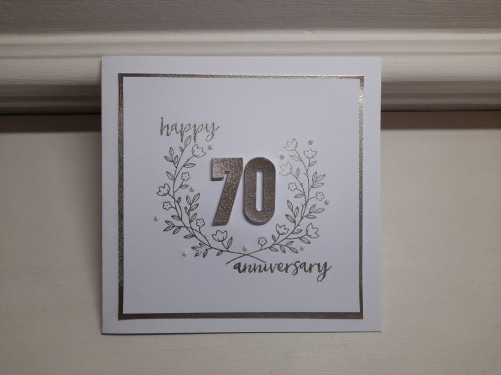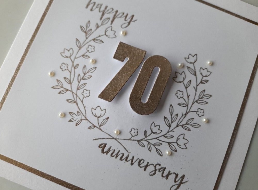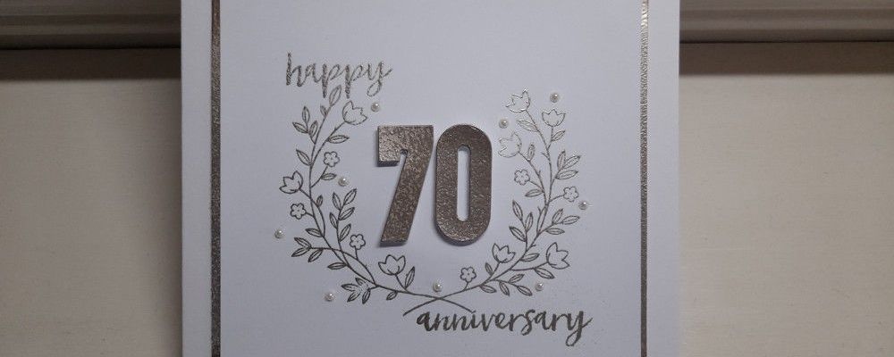 Welcome to my crafty blog. Today’s card is a bit of a special one – my ‘outlaws’ are celebrating their 70th wedding anniversary! (They’re known as the ‘outlaws’ as I’m not married to their son any more). 70 years is a platinum anniversary, so WOW’s ‘metallic platinum’ embossing powder was the obvious choice for their card. I also took inspiration from this week’s grid over at Tic Tac Toe challenge, picking up the bottom row of flowers, pearls, and my favourite WOW powder shade (the metallic platinum – as regular readers of this little blog will know)