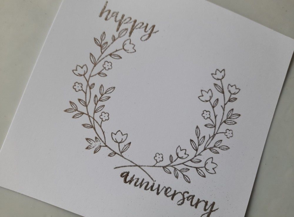 I started with a square of white card, and stamped the floral spray from the new Stampin’ Up! ‘gift of hope’ set in clear ink. I heat embossed it with the metallic platinum powder, and then added the ‘happy’ and ‘anniversary’ from the SU ‘Milestone Moments’ set, also embossed with the platinum powder.
