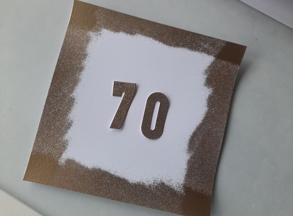 I wanted to mount it on a mat of the same shade, so cut a slightly larger piece of white card. I then used my brayer to roll clear ink along one edge, and added the platinum powder to then heat emboss. I repeated this on the other three sides, so the card was edged. I also embossed a scrap piece of card in the platinum and then die cut the numbers from it. Putting the ink on the card with a brayer, rather than pressing the card on your ink pad, gives a much more even finish – a great tip I got from Marion Emberson of Sugar and Spice Crafts