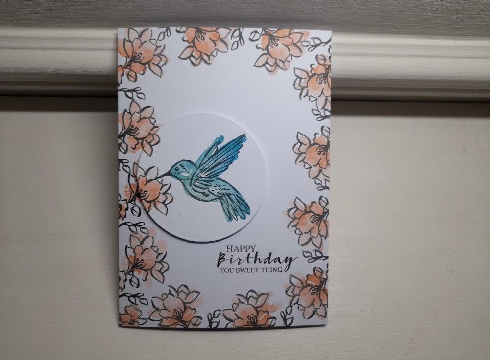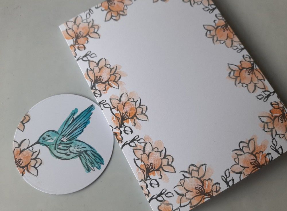 I started by die cutting a circle of white card, and stamped the hummingbird onto it in black Archival. I then lined the circle up on a 5×7 card blank, and held it in place with a piece of low tack tape, so I could stamp the flowers on the edge of the card to overlap onto the circle. I used my stamping platform for this, which meant I could stamp across the circle of card first, and then lift it off to stamp the rest of the image onto the card front, so that I didn’t get a gap.