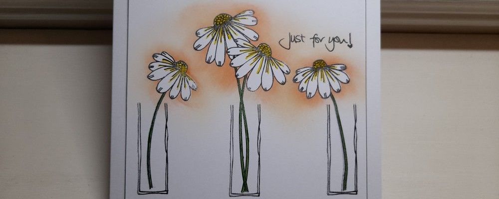 I started by stamping the three ‘vases’ for the daisies onto a piece of white card. These are made by masking off the top of the tag in the stamp set – I can’t claim any credit for this brilliant idea, as I first saw it from someone else who shared it on Julie’s Facebook page. Once the vases were stamped, I added the daisies. The great thing about clear stamps is that they can be repositioned, so I was able to reshape the single daisy so it curved towards the centre from both sides.
