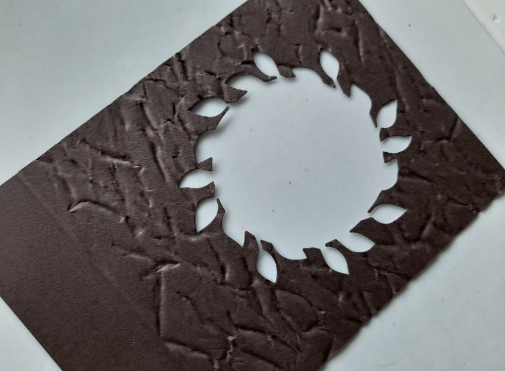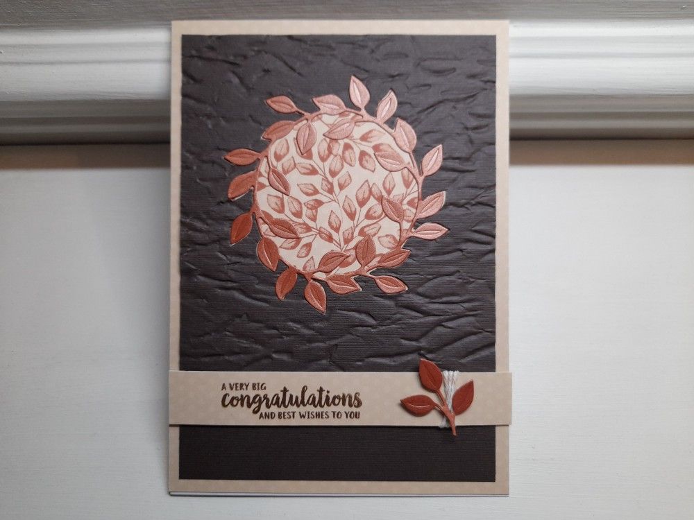 I started with a piece of brown card, cut slightly smaller than a 5×7 card blank, and embossed it using the Stampin’ Up! ‘old world paper’ folder. As it’s a square folder, it didn’t go right down to the bottom of the card, so I positioned it with the embossing ending three quarters down, as I was going to add a strip of paper across it there, and the plain card would sit below it. Once embossed I die cut the leafy circle from the SU ‘wreath builder’ die set.