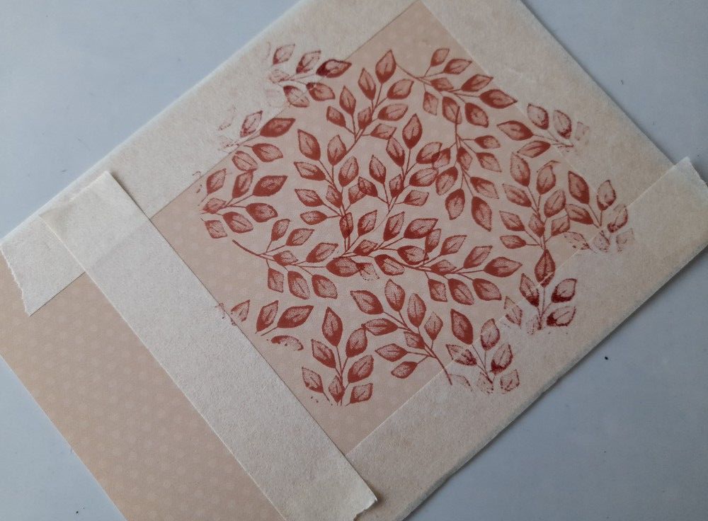 I then took my piece of backing paper, and stamped one of the small leafy sprigs from SU’s ‘forever ferns’ set over the middle, using ‘terracotta’ Artistry Ink. I masked the edge of the paper before starting, as the brown card was cut smaller than this piece and I didn’t want the leafy pattern to show around the edge.