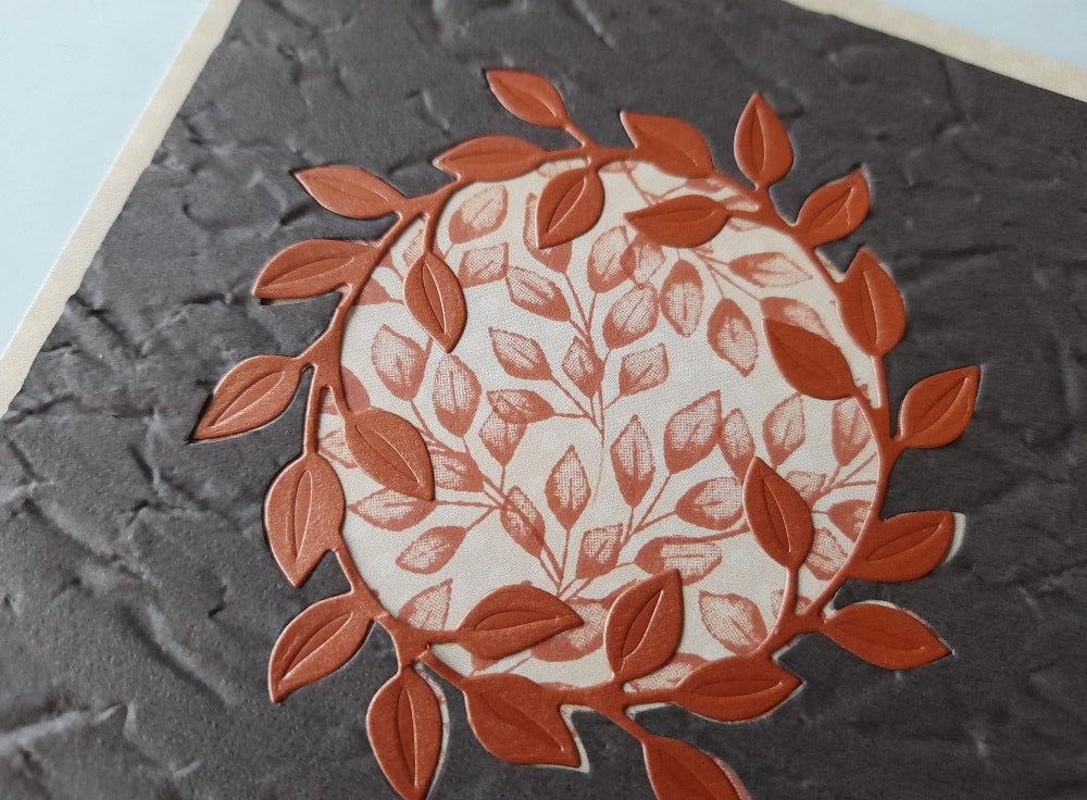 I then mounted the brown card onto the backing paper. I had planned at this point to reattach the inner part of the die cut, so the leaves were a negative image with the pattern showing through. I have to be honest – it did not look good! I tried adding the brown leafy wreath back in but there wasn’t enough contrast, so I cut another one in a terracotta card to pick up the colour of the ink.