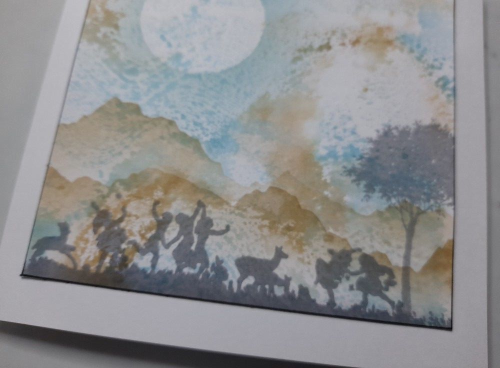 I then stamped the ‘meadowdance’ scene across the lower part of the card, using Archival ink in ‘shadow grey’, and added the tree from the set to the right hand side. The little scene didn’t go right across the card, so I used masking tape to line up along the bottom of the stamp image and then used the edge of the tree to fill in the landscape either side.
