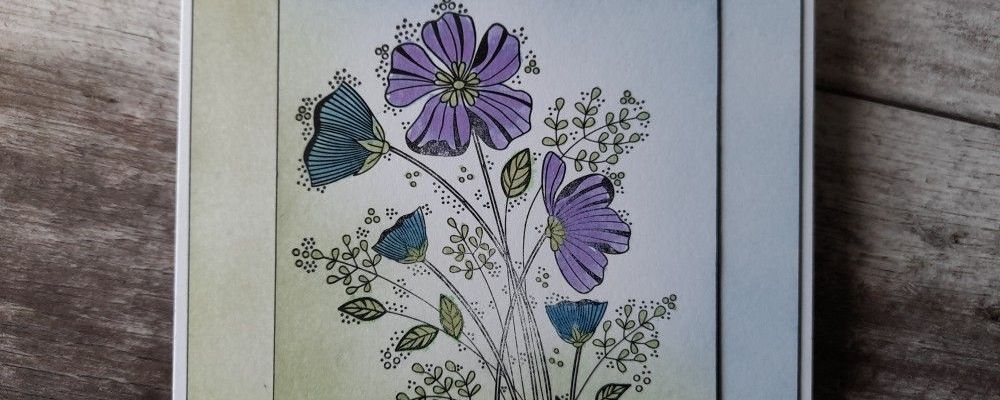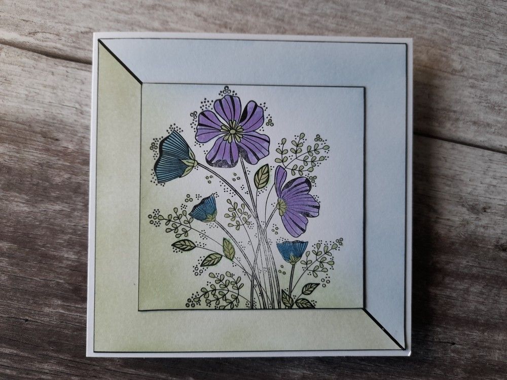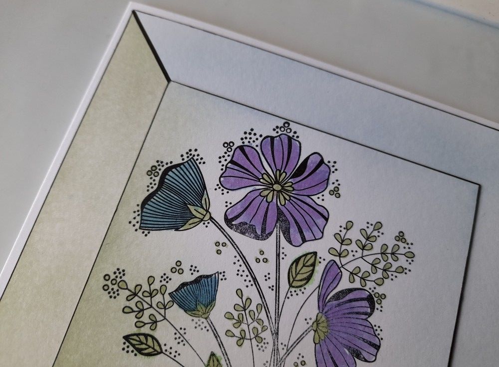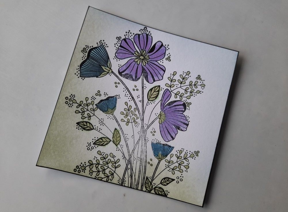 It won’t surprise you to know that I started by stamping the floral spray onto a piece of white card! I then coloured in the flowers and leaves using inks and a waterbrush – Artistry Inks ‘lush lilac’ and ‘wild bilberry’ for the flowers and Distress Ink ‘peeled paint’ for the leaves. Once dry, I brushed the ‘wild bilberry’ lightly across the top and right hand side of the card, and ‘peeled paint’ down the left and across the bottom, and then ran my new black Posca paint pen around the edges
