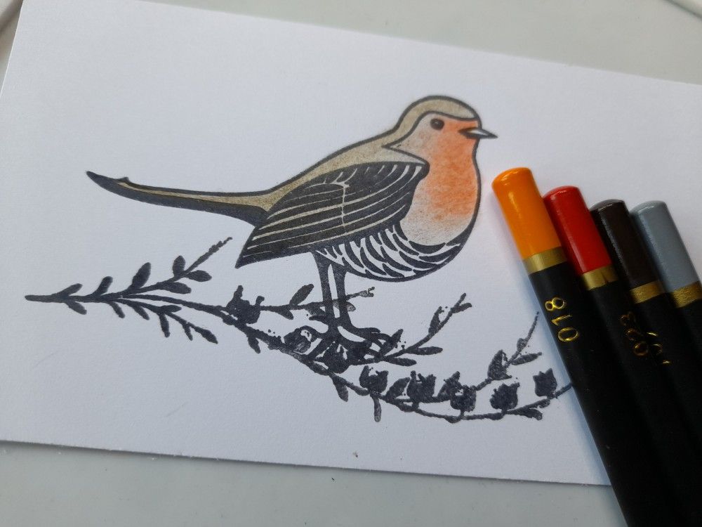 I started by stamping the branch from Clarity’s ‘journalling’ stamp set onto white card using ‘watering can’ Archival ink, and then added the robin to sit on the branch. I coloured him in using Spectrum Noir pencils.