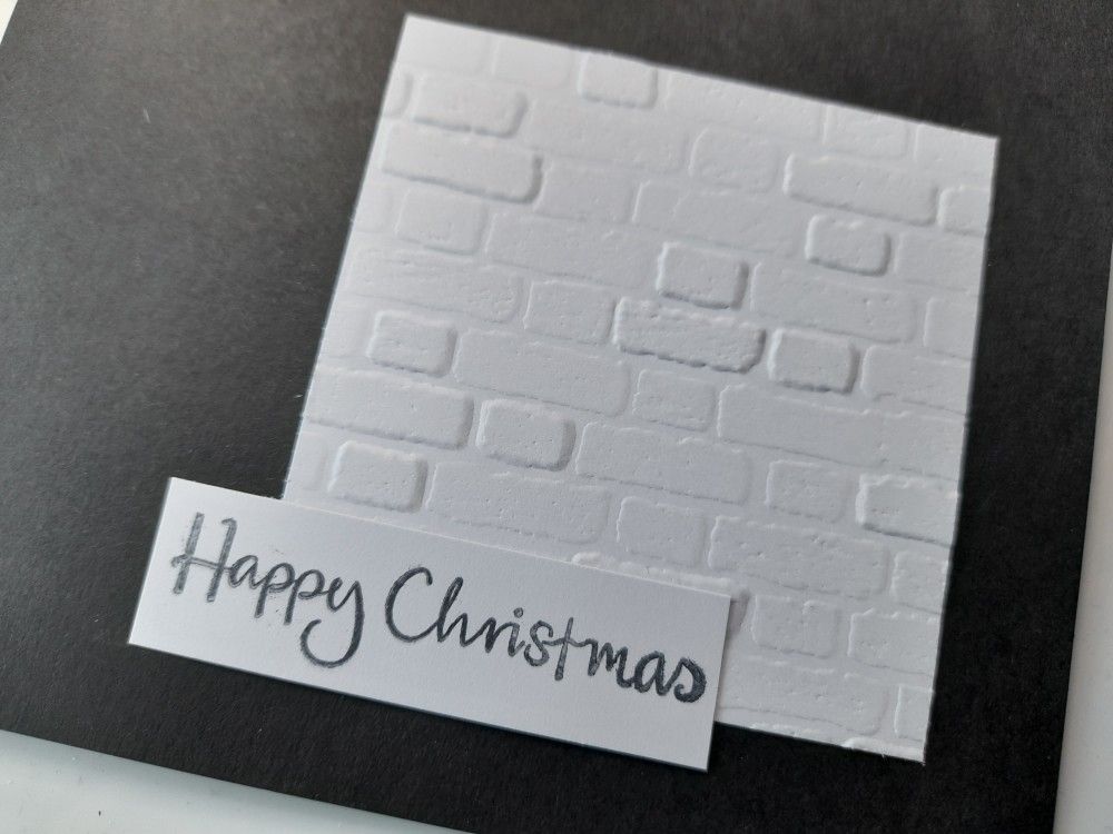 I decided to make the rest of the card monochrome, so his redbreast really stood out. I cut a small square of white card and embossed it with the Stampin’ Up! ‘bricks & mortar’ folder. That then sat on a 6×6 card blank, and I added the sentiment across the bottom. I stamped the sentiment, which is from Clarity’s ‘Barbara’s Christmas’ set, ‘watering can’ and then trimmed the card piece down before attaching it across the bottom of the embossed square.
