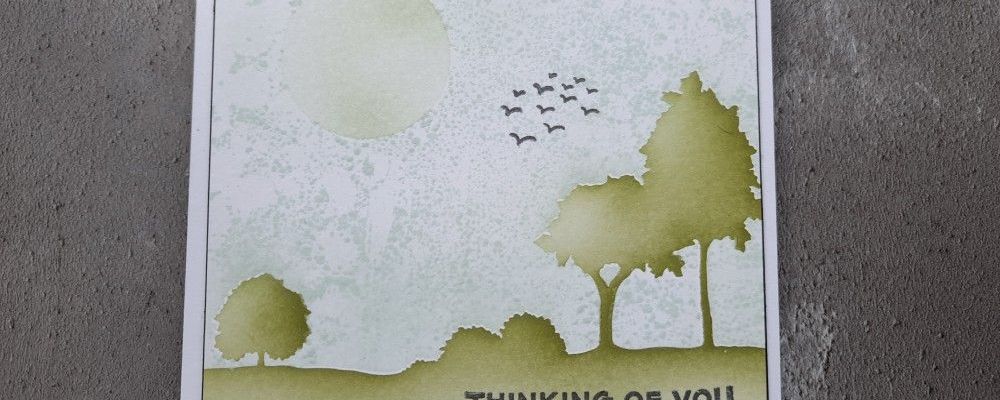Next step was to brush ink through the trees and the riverbank. I used a blending brush with Artistry Ink in ‘dry weed’ for the upper parts and ‘avocado’ for the areas where I wanted more shade. I forgot to take any photos at this point, but I then removed the outer mask and covered the trees over with the corresponding part as I wanted to colour the sky. I popped one of the moon masks into place and then stamped the sky in ‘morning dew’ using the large A5 stamp from Clarity’s ‘dots and spots’ mixed impressions stamp set… Once done, I replaced the moon mask with the outer part, so I could brush some colour across the ‘sun’. I used the ‘morning dew’, but think I still had a bit of green on my brush as it’s definitely got a greenish tinge. I think it looks OK though.