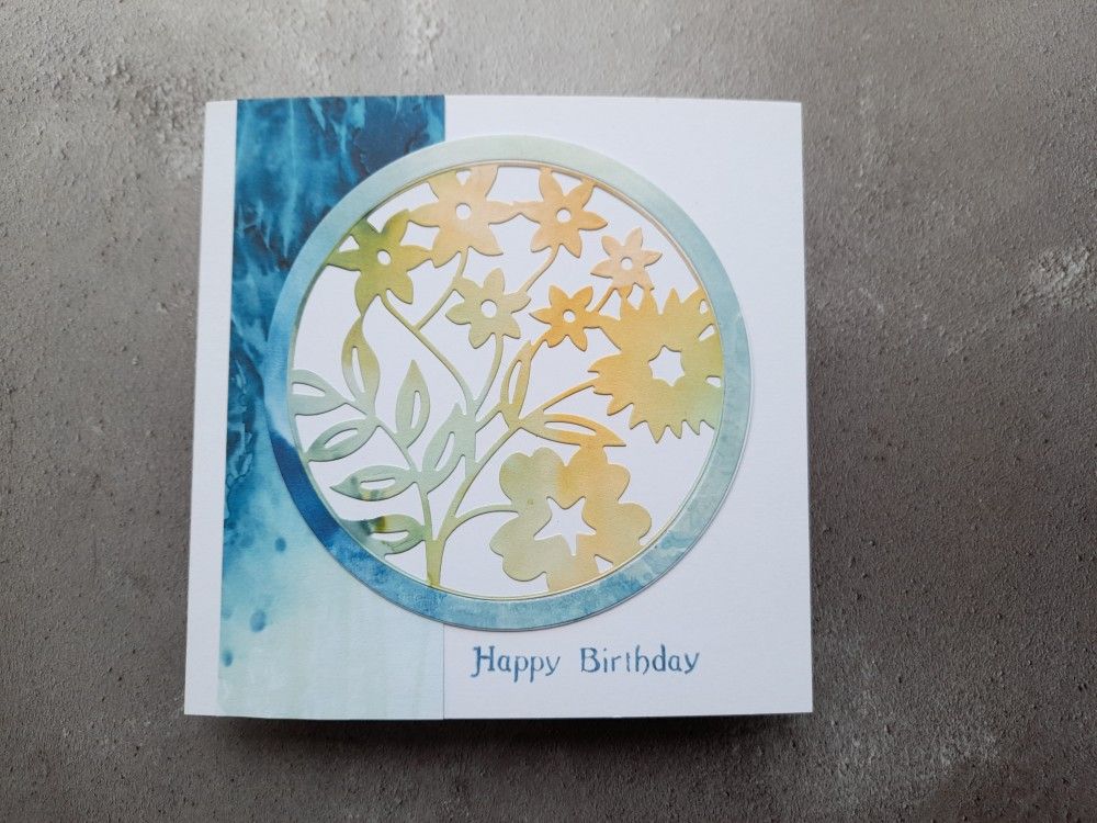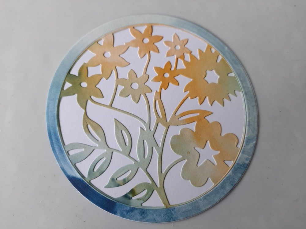 I positioned the floral die so the flowers sat within the peach coloured area of the paper, and then sat one of the nested circle dies around it so the whole image was cut out. I then reused the circle die together with the next size up to cut a frame (I used the other side of the paper for this to give a contrast), and stuck both pieces onto a circle of white card.