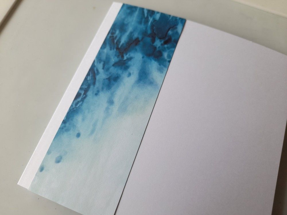 I then trimmed down a strip of paper from the piece I had left after cutting the flowers, and attached that to a 6×6 card blank. I love the blue tones in this piece.