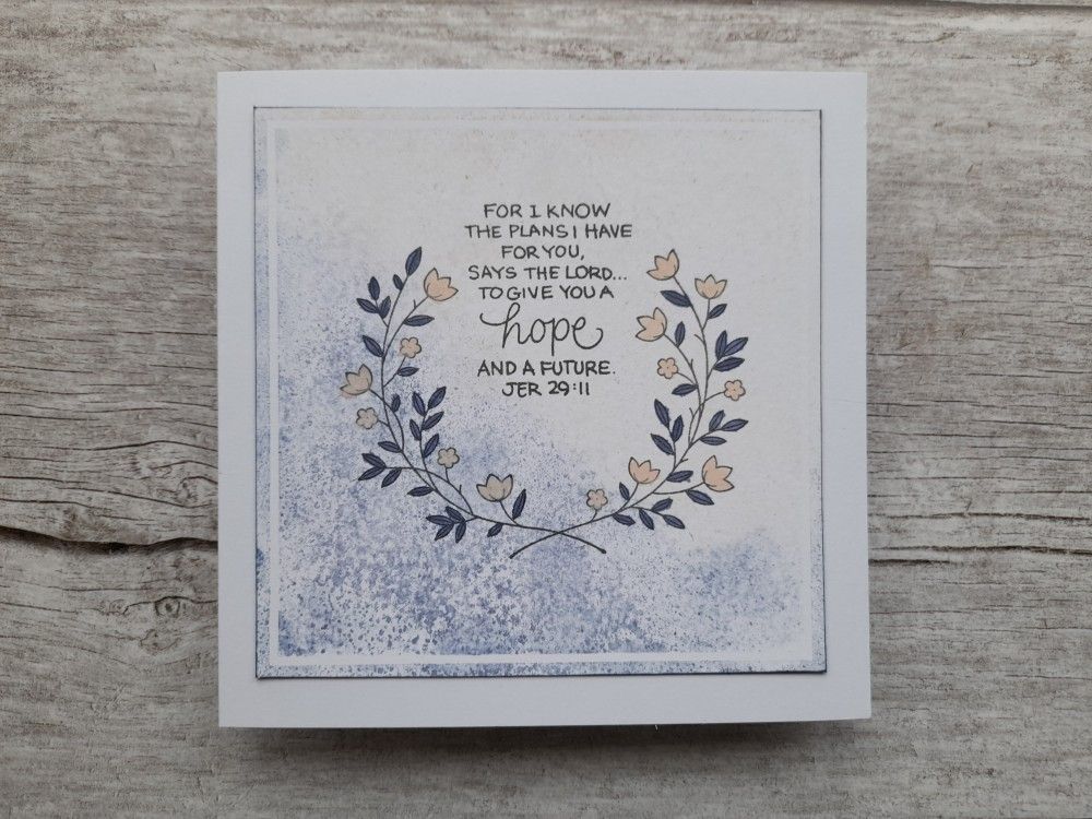 I started by stamping the floral wreath from Stampin’ Up!’s ‘gift of hope’ and then added the Bible verse from a Stampendous set, using Archival ‘watering can’ for both.