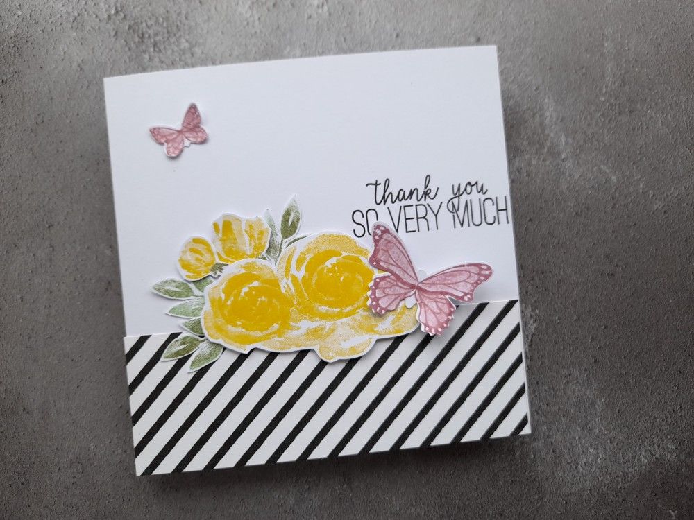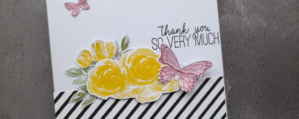 Great job combining the two challenges. I love what the stripes add to the card and prevent your floral arrangement from floating. Love how you used the colors of our challenge – love the watercolor effect of your butterflies. Great job, thanks for joining us this week at CC&S