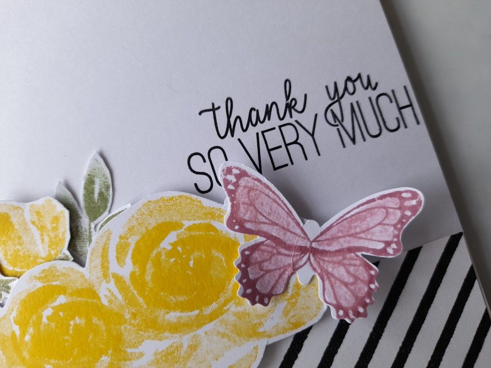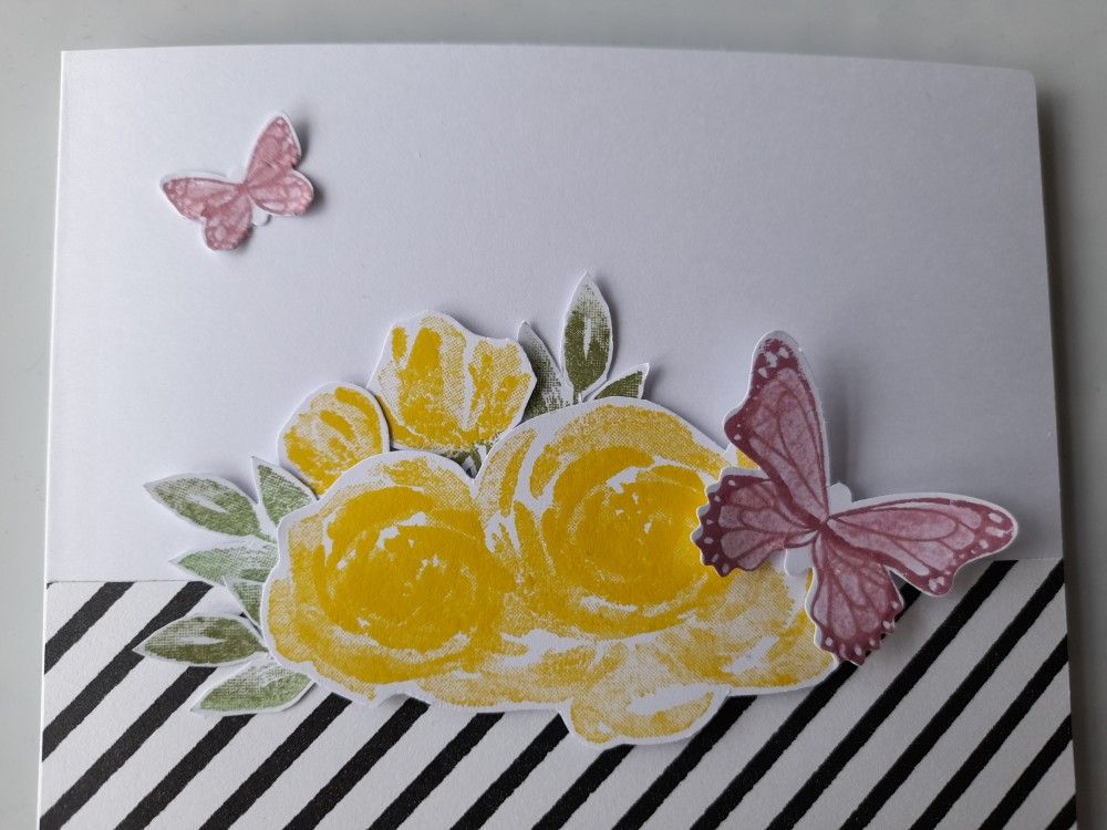 Once decided, I stamped the sentiment in Archival black, and then attached the flowers and butterflies using a mixture of foam pads and glue.