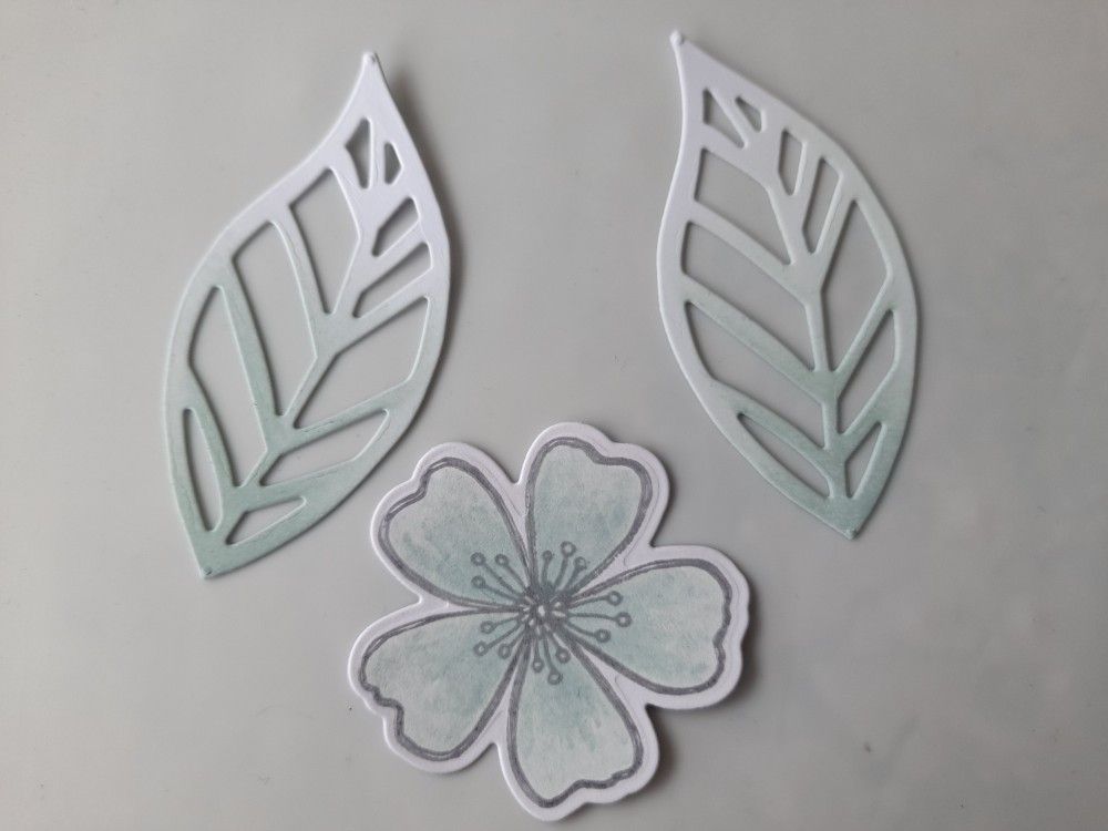 I started by stamping the flower from the ‘fresh florals’ set in ‘shadow grey’ Archival Ink, and then coloured it using ‘speckled egg’ Distress Oxide and a waterbrush. I cut it out using the co-ordinating die, together with the two large leaves from the ‘delightful daisy’ set. I then brushed ‘speckled egg’ across the inner part of the two leaves.