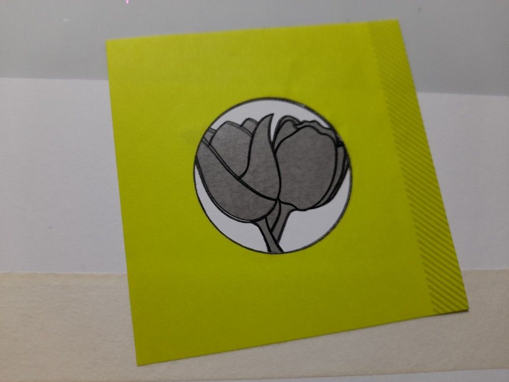 I started with a piece of white stencil card, cut to fit on a 6×6 card blank. I’d decided to use the circle from Clarity’s ‘Tina’s flowers and butterflies’ to frame the flowers, but needed to stamp the double tulip first as it is slightly larger. I lined up my card on my squared mat and positioned the tulip to sit in the centre of what would be the top row, using a strip of masking tape to keep the images level. I then covered it using the precut mask that comes with the set and stamped the circle over the tulip, again using black Archival ink. I also stamped the circle onto a sticky note and cut out the inner part to give me a mask, which sat over the image.