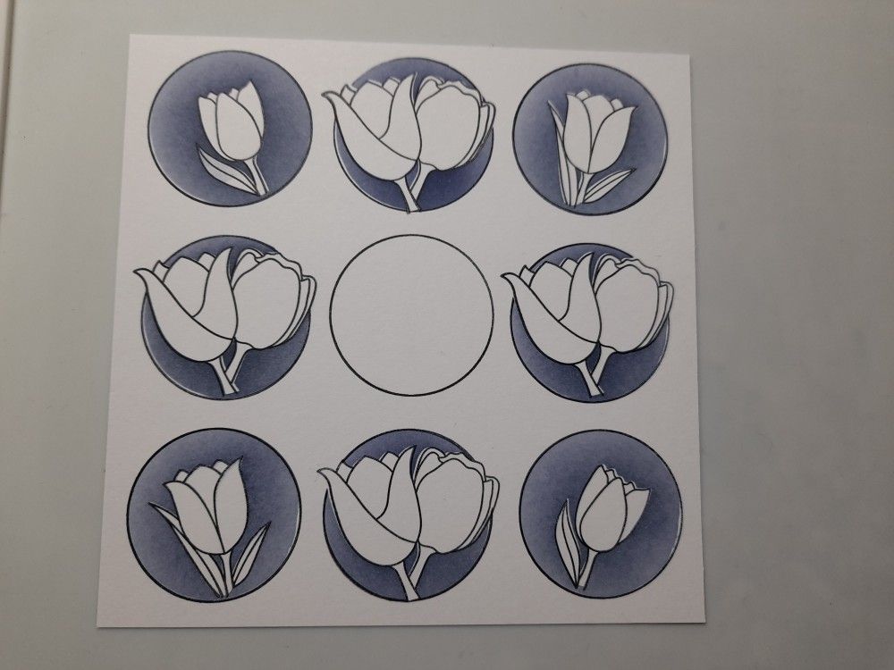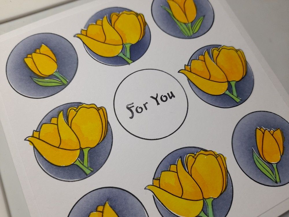 I then used ‘chipped sapphire’ Distress Oxide and a blending brush to colour in the background around the tulip. Once done, I stamped two more circles across the top row, and added the small tulips from the set, again masking and blending ‘chipped sapphire’ into the backgrounds. I repeated the same process with the double tulips for the two outer circles in the middle row, leaving the centre one blank for the sentiment, and then added the bottom row.