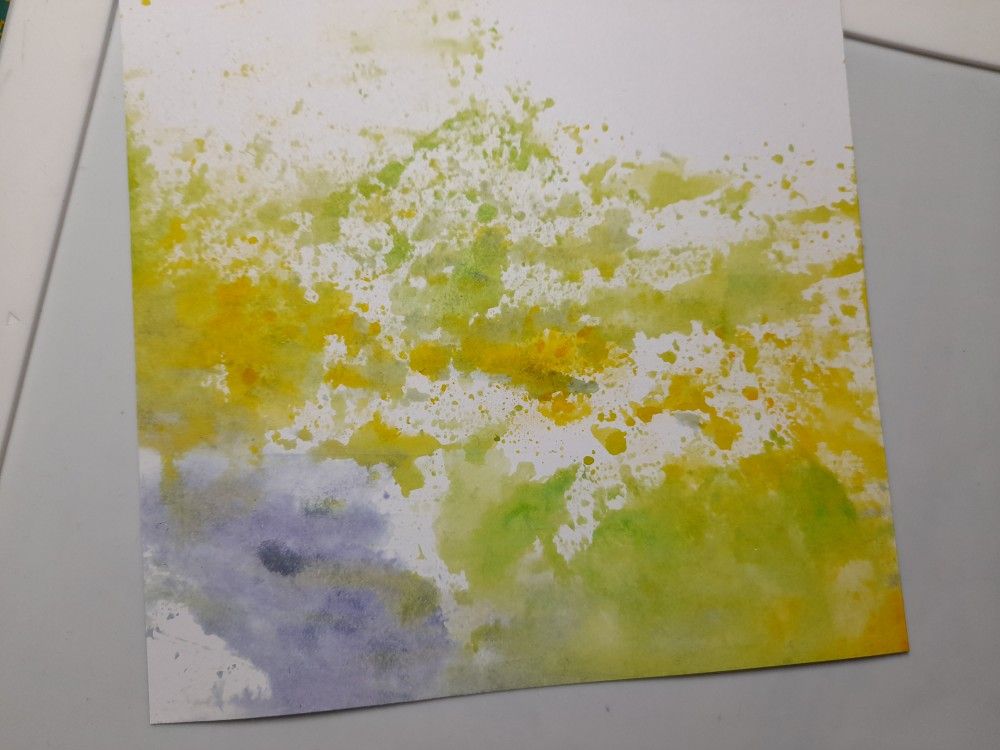 I just spritz them lightly with water and then blot a piece of stencil card onto the mat to pick up the ink. It’s a bit unpredictable, but you can get some lovely results. I leave the card to dry and then put it under one of my craft boxes overnight to flatten out – I also try to remember to write the ink colours on the back so I can remember when I come to use it! Here’s the one I got from today’s card.