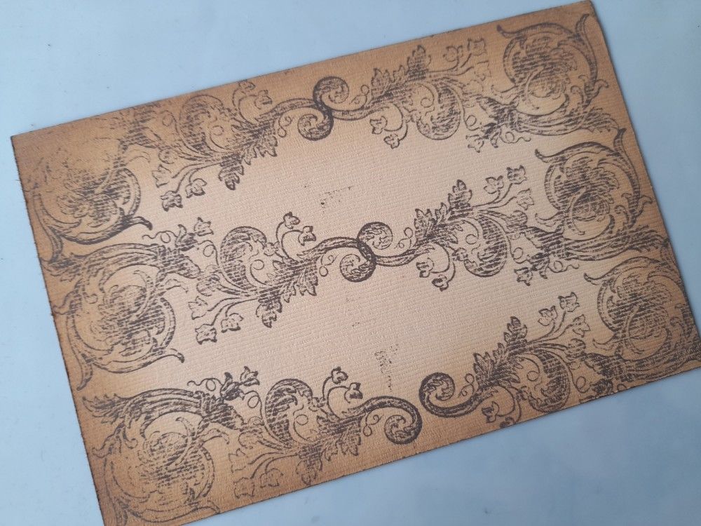 I started by making a 5×7 card blank from kraft card, and then cut a piece of light orange to fit onto the card. I stamped around the orange card using a swirl stamp, which the Crafty Individuals team generously sent as a freebie with one of my orders, and ‘walnut stain’ Distress Oxide to tone in with the kraft card. I also blended some of the ‘walnut stain around the edge of the card for a more vintage look.