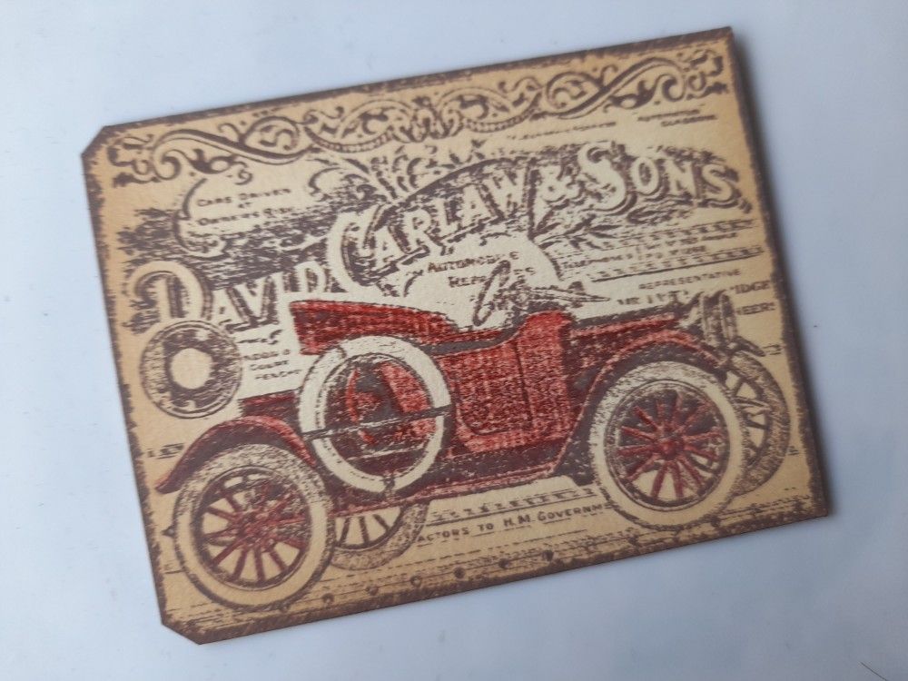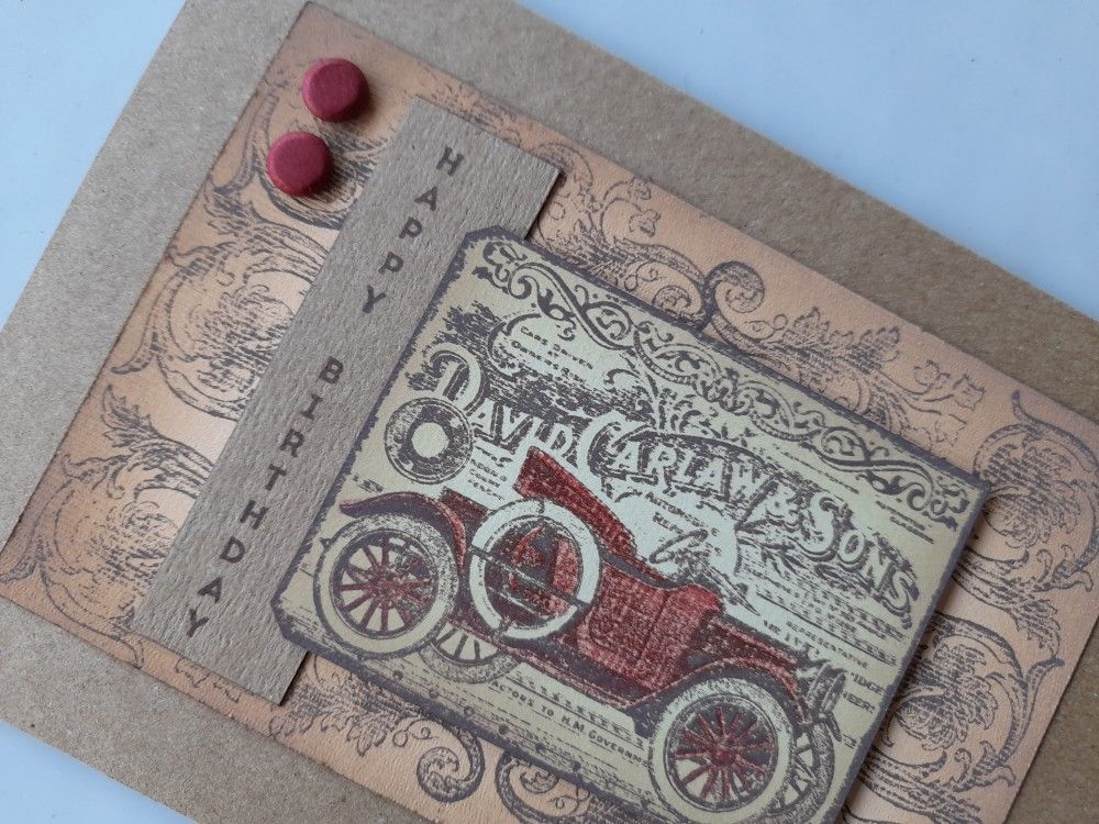 The next step was to stamp the car tag onto some pale yellow card, again using the ‘walnut stain. I coloured the car with a dark red Spectrum noir pencil and then trimmed the card to the edge of the stamp image before again blending ink around it.