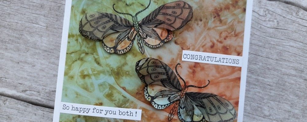 Welcome to my crafty blog. I’ve been playing with the new ‘butterflies and moths’ stamps designed by Cherry Green for Claritystamp. Barbara Gray did a brilliant online step by step yesterday for the monthly Moment of Clarity, and I didn’t want to put them away afterwards! I’ve used a combination of the Clarity designer paper and parchment for this card – because they are identical designs it’s easy to produce matching overlay sections.