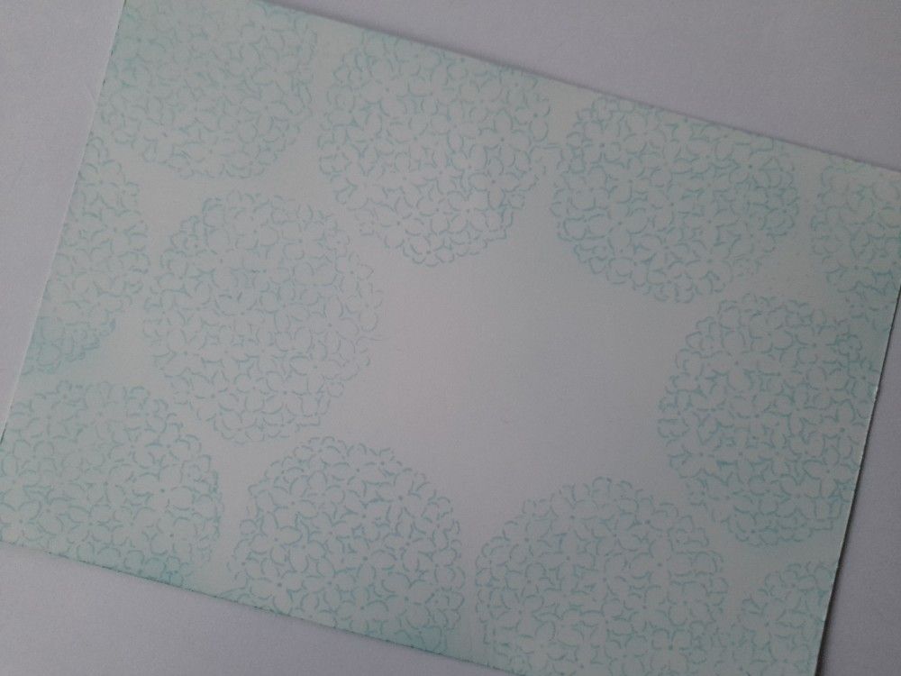 I started by stamping the flower head in ‘aqua fusion’ Artistry Ink (I masked off the leaves each time I inked the stamp) to cover a piece of white card that I’d trimmed to be slightly smaller than a 5×7 card blank. I then used a brush to blend the ink over the stamped images, to soften the white card.